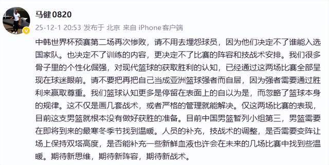 在中国男篮2连败之后,马健老师在社交平台公开发声,“请不用去埋怨球员,因为他们决定不了谁能入选国家队。也决定不了训练的内容,更决定不了比赛的阵容和技战术安排。”显然,这就是在说郭士强了,说中国男篮教练组了,毕竟选谁,练什么,怎么准备,都是教练组的事情。