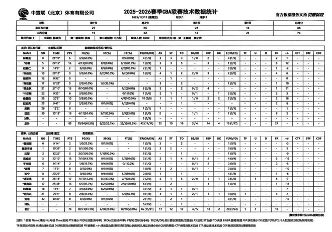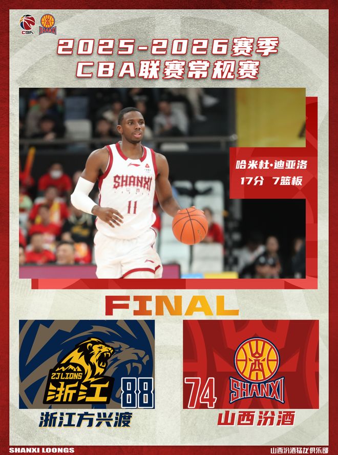 北京时间2025年12月12日19:35,2025-2026赛季CBA联赛常规赛正式开启,山西汾酒踏上新征程,在揭幕战中挑战上赛季冠军浙江方兴渡。两队历史上共交手51次,山西汾酒18胜33负,上赛季常规赛两队交手4次,山西汾酒2胜2负。本场比赛,山西队整体发挥不佳,进攻端处理球过于急躁,导致命中率偏低,全队配合不够默契,最终遗憾失利,全场比赛结束,山西汾酒74:88不敌浙江方兴渡。新赛季刚刚开始,希望球队尽快找回比赛状态,继续前进!