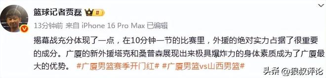 篮球记者“贾磊”发文点评:“揭幕战充分体现了一点,在10分钟一节的比赛里,外援的绝对实力占据了很重要的成分。广厦的新外援塔克和桑普森展现出来极具爆炸力的身体素质成为了广厦最大的优势。”